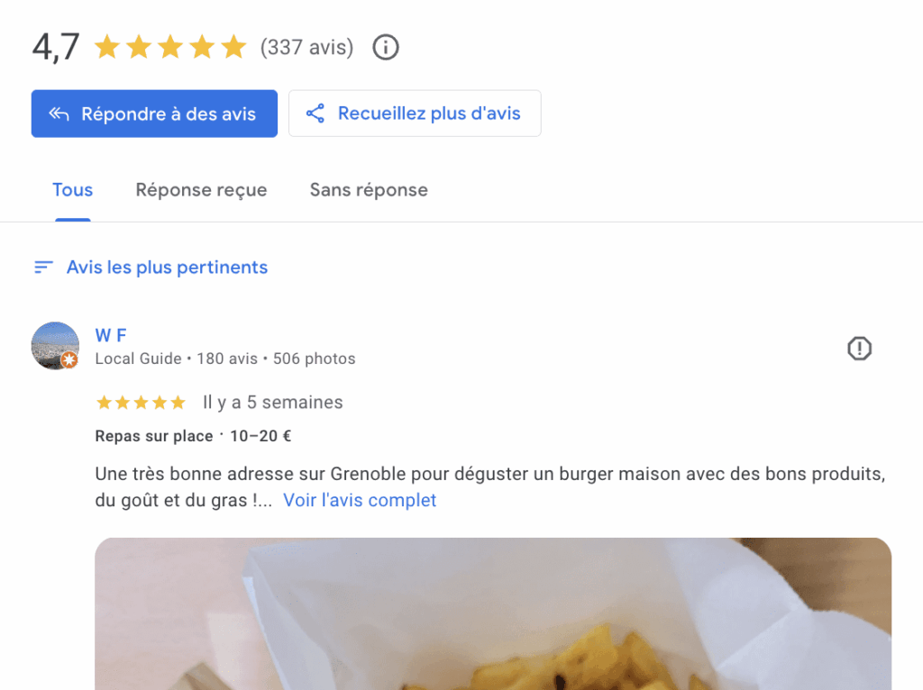 Chez un restaurateur grenoblois, notre audit et optimisation de fiche ont généré +30 % de commandes en 6 mois, mesurés dans Google Analytics.