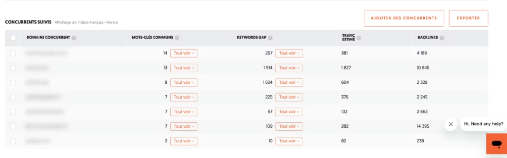 Sur cet extrait, les concurrents suivis présentent des profils très hétérogènes : peu de mots-clés communs, mais des écarts importants sur les requêtes manquantes et le trafic estimé. Ce type de configuration montre que la concurrence ne se joue pas sur une bataille frontale, mais sur des angles éditoriaux et des périmètres différents.