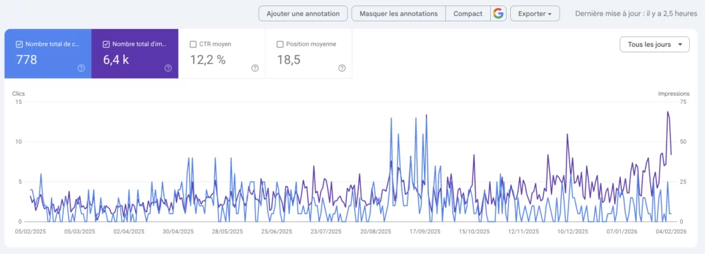 Sur une période de 12 mois, un site client accompagné par Perfoséos a généré 778 clics issus de la recherche organique, à partir d’environ 6 400 impressions, avec un taux de clic moyen de 12,2 %.